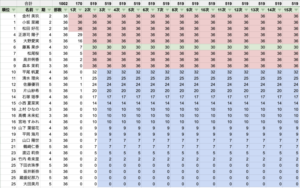 こうすることで、単純にランキングを出すだけでなく数値で人気の差が明らかになります。また、早期に完売部が出たメンバーの評価も高く反映することが出来ます。