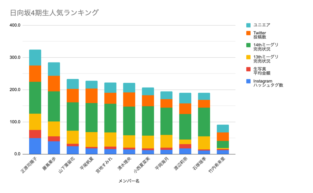 順位 | メンバー名 | スコア | Instagram ハッシュタグ数 | 生写真 平均金額 | 13thミーグリ 完売状況 | 14thミーグリ 完売状況 | Twitter 投稿数 | ユニエア |