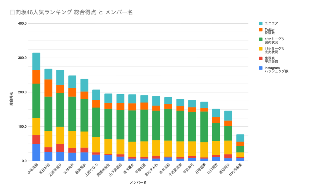 あと、提案されていらっしゃる方がいますが動画のいいね数とか、ユニエア・ひなこいなど日向坂のゲーム関連の指標を入れてみると、より多角的になって良いのではないかと思います。