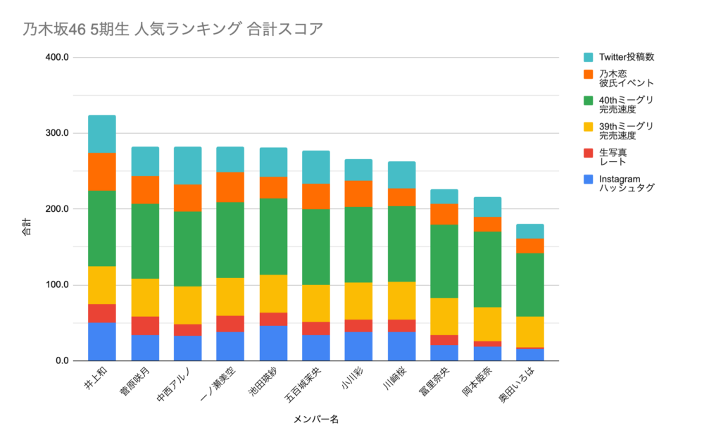 | 順位 | 名前 | 得点 | Instagram ハッシュタグ | 生写真 レート | 39thミーグリ 完売速度 | 40thミーグリ 完売速度 | 乃木恋 彼氏イベント | Twitter投稿数 |