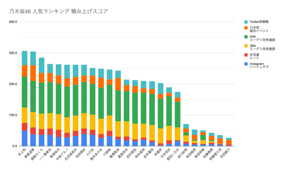 | 順位 | 名前 | 期 | 得点 | Instagram ハッシュタグ | 生写真 レート | 39th ミーグリ完売速度 | 40th ミーグリ完売速度 | 乃木恋 彼氏イベント | Twitter投稿数 | |