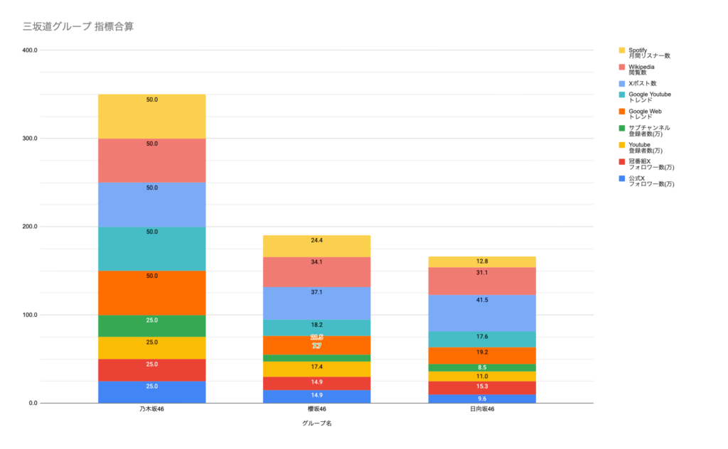 2位は櫻坂46。日向坂46と比べるとGoogleトレンドやWikipedia閲覧数が高く、世間からの関心が高いことが伺えます。