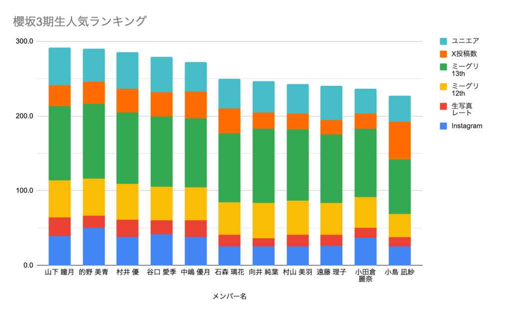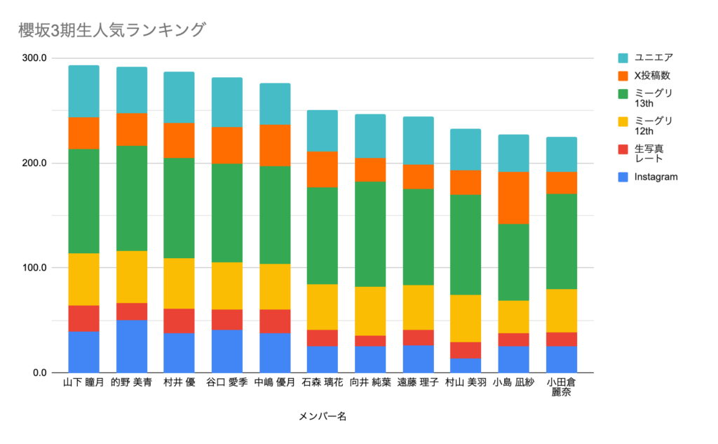 | 順位 | メンバー | 総合 得点 | 生写真 レート | ミーグリ 12th | ミーグリ 13th | X投稿数 | ユニエア | |